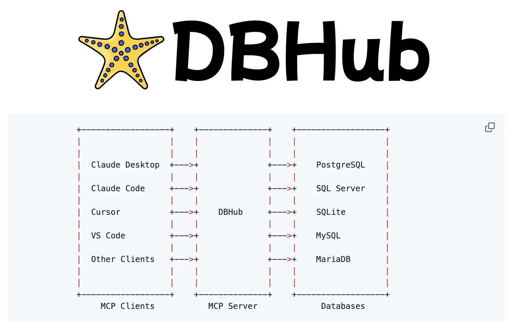 As of early 2026, DBHub has over 100K downloads and 2K GitHub stars. It supports multiple databases including PostgreSQL, MySQL, MariaDB, SQL Server, and SQLite. Key features include: